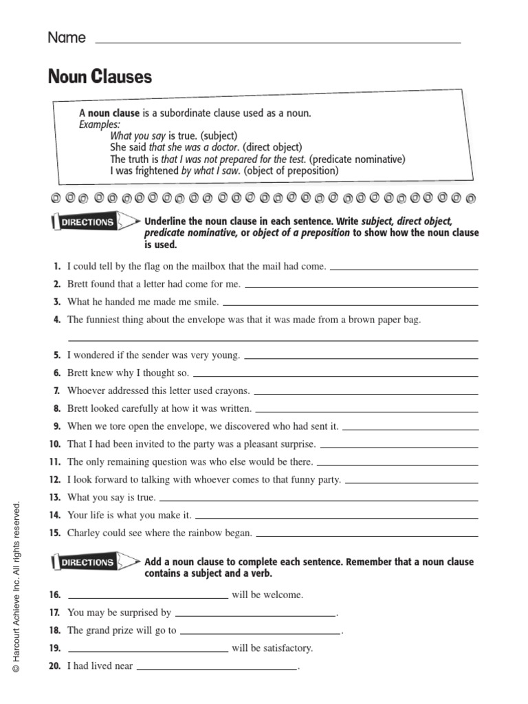 A noun clause is a dependent clause that consists of a subordinating conjunction followed by a clause and that performs a nominal function. Carlie's problem was that she didn't practice enough. The terms predicate nominative and predicate noun are also used for noun clauses that function as subject complements. As objects, nouns may be direct objects, indirect objects, or objects of prepositions. They can function as subjects of sentences or clauses, predicate nominatives, or objects. Remember that a noun names a person, place, thing, or idea. Examples of predicate nominatives in the examples below, the linking verbs are in bold and the predicate nominatives are shaded. A predicate nominative might be phrases or clauses. (object of preposition) underline the noun clause in each sentence. That, whether, what, who, whom, which, whomever, why, how, when, where, whose Start by looking at a sentence and trying to find a dependent clause. Subject complements are also called predicate nominatives or predicate nouns. in the following examples, the predicate nominative is bold and the subject is underlined..